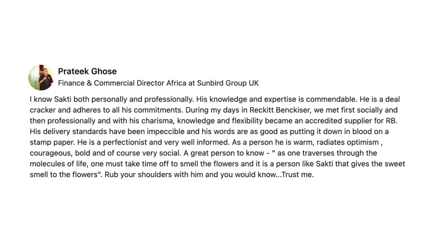 With over 40 years of Experience from the Shop-floor to the Boardroom, with Leaders & Businesses in India, Africa & other Markets, Sakti is an Outcome-focused Business Strategist with strong Operational and M&A process experience. He is trained in nurturing business systems and investments to maturity, through the design & implementation of strategies that work in different scenarios - Turnaround, Restoration, Growth & Value creation. Sakti is also a Certified CEO Coach, fondly known as ‘Coach SAM’.