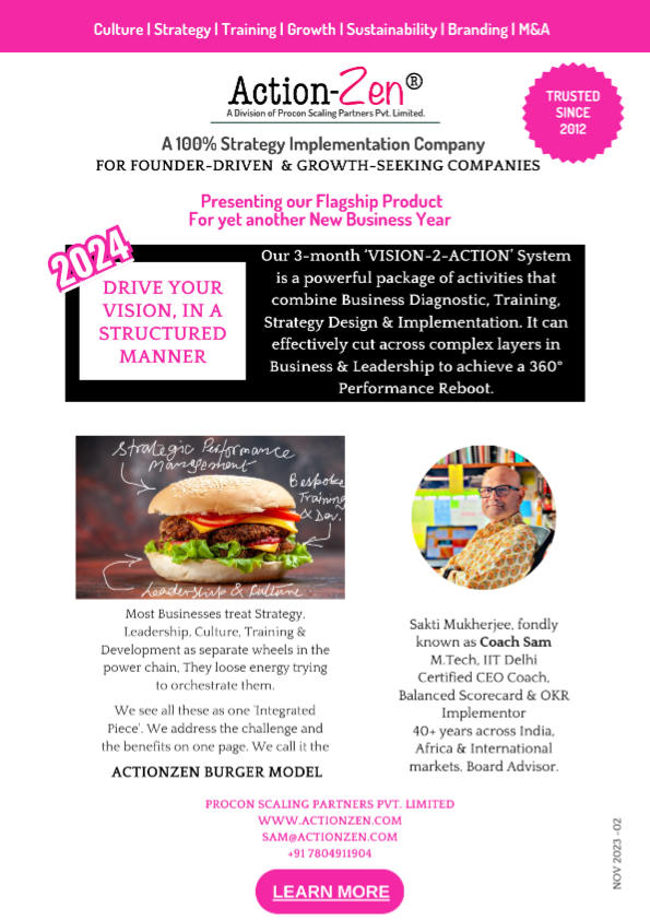 The "V2A" is a mixture of Business Diagnostic, Process Interventions, System Changes, Training, Learning and lot of hands-on implementation inside the business. Download and read the Brochure to learn how the programme flows from Day-1 to Day-100 and gives your business a 360 degree Performance Reboot .